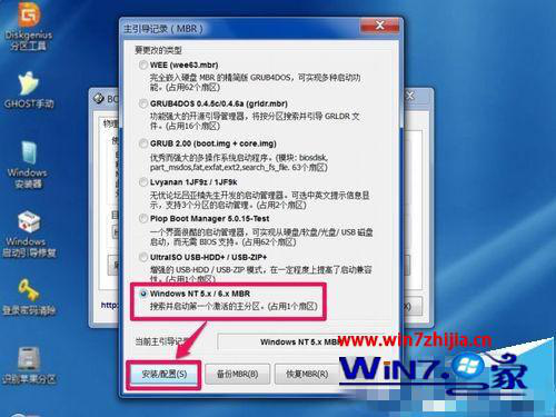 5、如果是旧版本的bootice软件,XP选择nt5.x,Win7选择nt6.x,现在新版,nt5.x/nt6.x混在一起,统一选择一项即可。选好后,按“安装/配置”这个按钮;