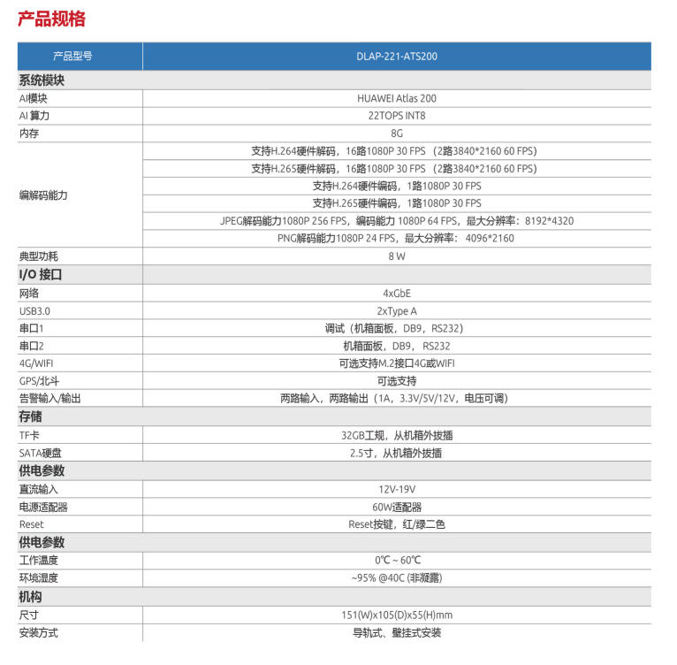 • 内置华为异腾Atlas 200 Al智能计算模组,集成高性能Ascend 310 Al处理器,多级算力配置(22TOPS INTS或11TOPSFP16)
