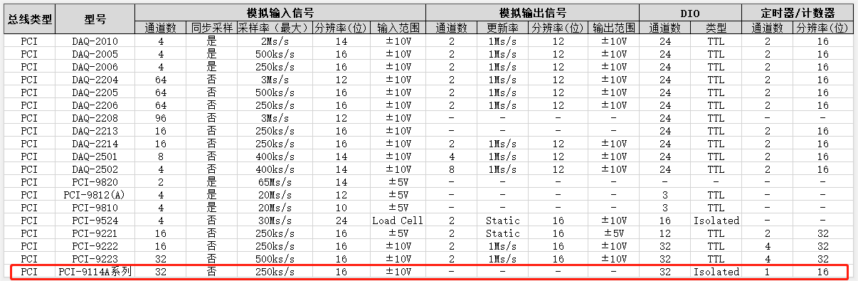 16路AI(32位,250KS/s),32路DIO,1路计数器/定时器(32位),PCI 多功能I/O设备。