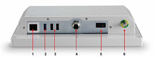 1. 局域网端口 2. US B3.0端口 3. US B2.0端口 4. 电源12VDC 5. 备用按钮 6. 病人电位均衡连接针(POAGS6) |