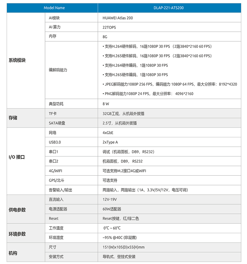 ・内置华为昇腾Atlas 200 Al智能计算模组,集成高性能Ascend 310 AI处理器,多级算力配置(22TOPS INT8或11TOPS FP16)